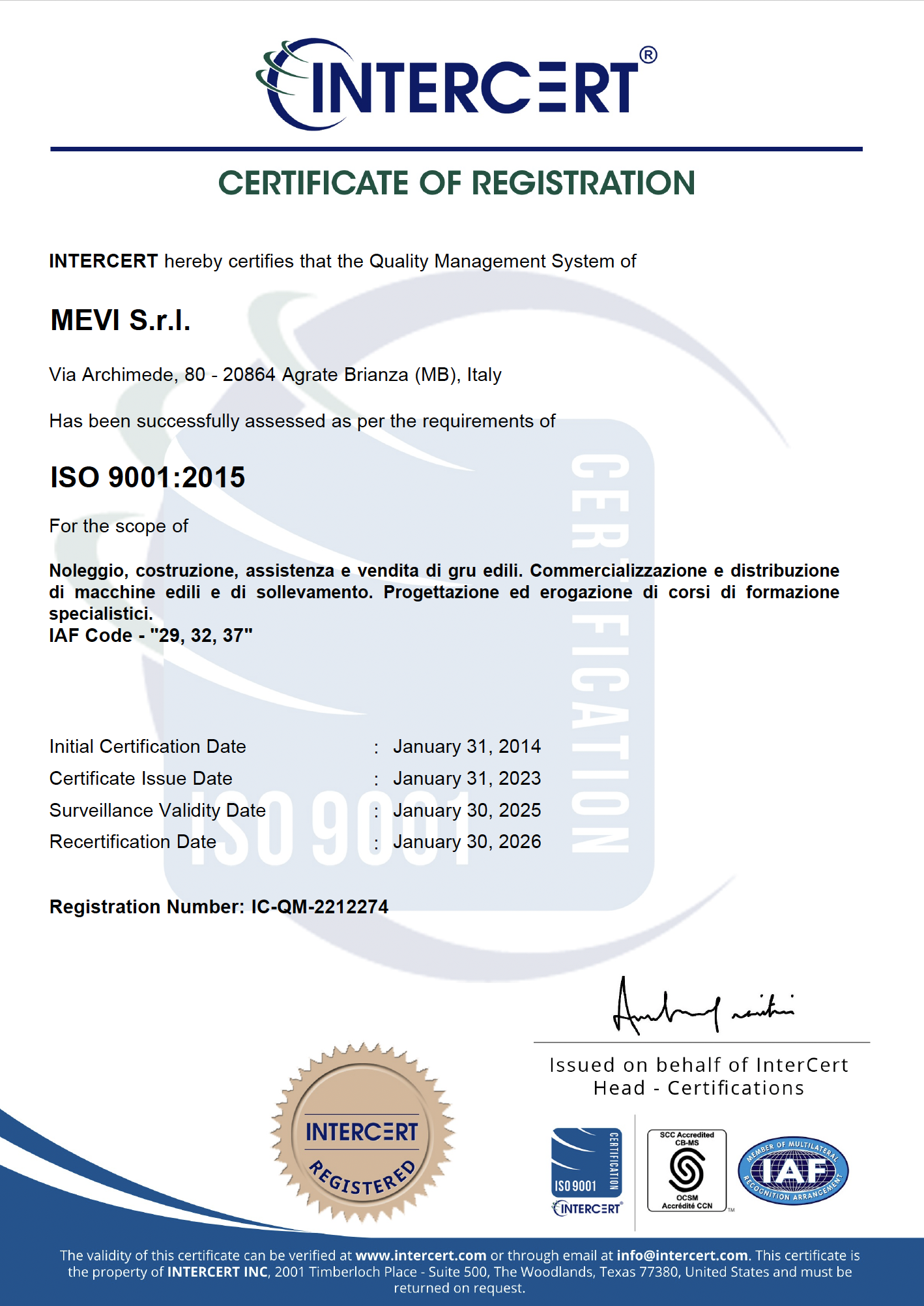 Certificata ISO 9001, Mevi garantisce elevati standard di qualità e sicurezza per ogni gru.